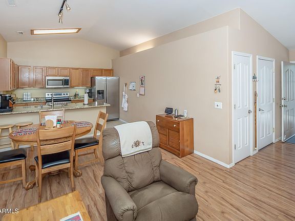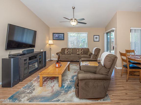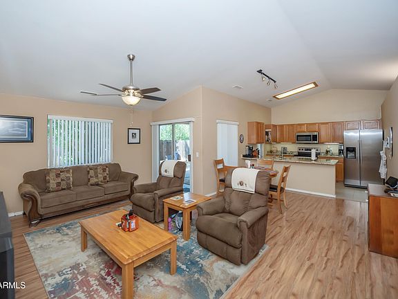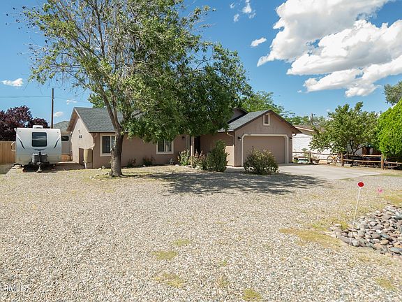 Here is a Great Value w/Excellent Location of Prescott Valley in TURNKEY Condition!!!! This dandy has 3Bedrooms/2Bathrooms/2CarGarage, with a 1128 Sq Ft Cluster Floor Plan, GREAT ROOM Concept, Ceiling Fans, Honed Wood Laminate & 12'' Tile for flooring, 2 Tone Paint, Plant shelves, Indirect Lighting, & has Vertical Blinds throughout. Kitchen is nicely appointed w/Oak Cabinetry, GRANITE Countertops, Stainless Steel Appliances (Inc. Fridge), Eat-In Kitchen, Breakfast Bar, & Under Cupboard Lighting. Master is Good Sized, has Single Sink, Large Stall Shower, & Walk-In Closet. Additional Features include Private Back Yard w/Privacy Fence, Covered Patio w/extended Paver Patio, Rain Gutters/Downspouts, Rain Harvesting barrels, Full RV Hookups/Parking, New Roof in 2020, 8'x8' Tuff Shed, Covered... Front Porch, Newer Exterior Paint, & Security Screen Door.