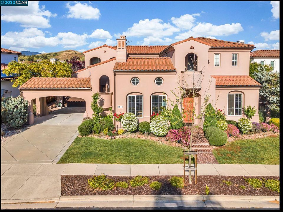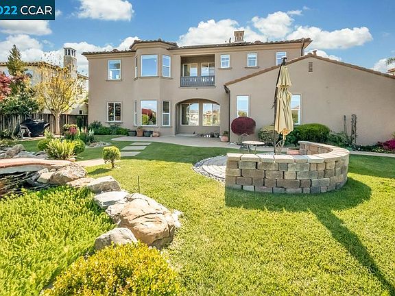 Spectacular home on large lot. Spacious open living area. Newer wood flooring throughout main level. 5 bedrooms & 5 bathrooms, plus office & courtyard & balconies. Kitchen features quartzite/granite island/counters, stainless steel appliances, & walk-in pantry. Primary bedroom suite has balcony with view, jetted tub, dual sinks & dual walk-in closets. Main level has a guest bedroom suite. 3 car tandem garage with Tesla charger. 2 fireplaces. Dual zone heat & AC. Solar electricity (owned). Low HOA dues include community pool and tennis. Huge park nearby for basketball, tennis & playground equipment. Highly regarded schools.