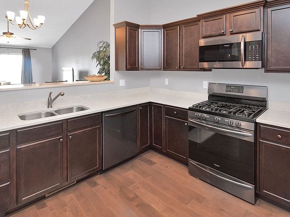 Throw away your snow shovel and lawn mower and enjoy a maintenance free community! This ranch style townhome boasts 3 bedrooms, 3 baths, an open main floor living area, a finished basement and an attached 2-car garage. The large kitchen features Quartz countertops, ample custom cabinetry and a breakfast bar that opens to the generous family room with a tall cathedral ceiling, plenty of natural light and hardwood flooring. The spacious main floor master includes a large walk-in closet and an en suite bath. The additional front bedroom is appointed with a walk-in closet. The finished basement provides a large family room, bedroom with walk-in closet and full bathroom. The 1st floor laundry includes gorgeous built-ins for fantastic storage. A must see home that is priced to sell!