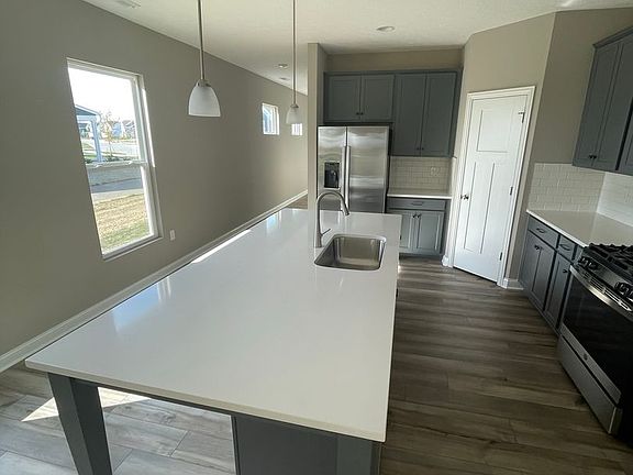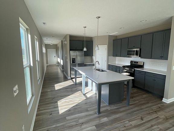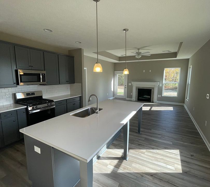 Step inside to a bright, open floor plan filled with natural light. The kitchen features an oversized island with seating for five, quartz countertops, GE stainless steel appliances, soft-close cabinetry, and LVP flooring. The Great Room includes a cozy fireplace with a custom mantle and a tray ceiling with recessed lighting, creating an inviting space for relaxing or entertaining.