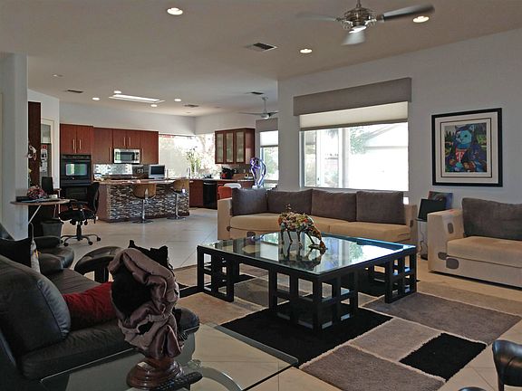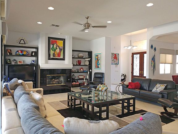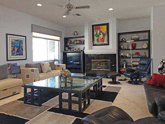 Sneak peek before professional photos. This highly sought after Great-Room Portofino model with a saltwater pebbletech pool, has been highly upgraded in a tasteful contemporary style. As you enter through the leaded glass double-entry doors, you notice the beautiful 24 inch tile floors and feel the spaciousness and warmth of the open flowing floorplan. The kitchen has granite counters, custom euro-style cabinets, tall etched glass pantry door, wine fridge, newer appliances, gas cooktop, can lighting, and a custom corner window. This home has a fireplace, 2 ensuite guest bedrooms with custom vanities, and a powder bath. The formal dining room is bright and inviting and large enough for the whole family at Thanksgiving. The master bedroom has been modified with an extra 200sf.+/-custom walk-in closet and has a fabulous office space with a view of the pool and doors out to the yard. The master bath has dual granite slab vanities, a custom contemporary tile shower, a towel warmer, 2 closet systems, and leads to the retreat room with plantation shutters and a flat screen TV. The back yard has mtn. views and is perfect for entertaining around your pool, with the built-in BBQ kitchen, flat-screen outdoor TV and lots of room to lounge around and enjoy the weather. The garage has epoxy flooring, workbenches, storage cabinets and lots of tools available for the project person. The HVAC system is only about 2 year old. The laundry includes the W/D. Furnishings available outside of escro