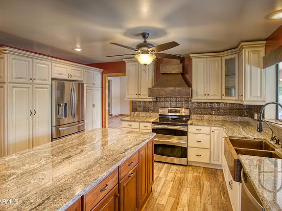 The Kitchen features a unique and beautiful granite countertops, Copper Sink and oven Hood, stainless steel appliances, tons of custom cabinetry, with a Microwave and a Wine Fridge built into the Island.