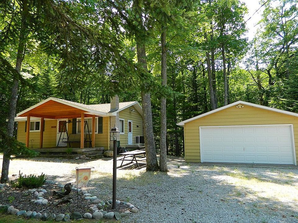Well maintained home with a newer natural gas heating system and on-demand water heater. Main level bathroom has been updated with a large, walk-in shower. There's plenty of room in the lower level which has a sliding door to the back yard. A newer wood stove was installed in the family room and provides another source of heat. There's a quaint, covered porch on the front and a deck off the kitchen. Seller installed a circle drive in front of the house and garage. This property allows you to have the beautiful view of woods and a neighborhood setting, all in one. Enjoy the convenience of having Hubbard Lake down the road and White Pine Golf Course just around the corner.