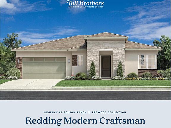 Timeless design meets modern elegance in this thoughtfully curated Redding home design from the Redwood Collection, featuring a warm Modern Craftsman elevation. With 2 bedrooms and 2 bathrooms, this 1,563-square-foot home showcases high-end finishes from the Cool Transitional Luxe designer package. The open-concept great room features a 42 Novus fireplace and a 12'x8' multi-stacking door that seamlessly extends living space to the outdoors, ideal for entertaining or relaxing. A chef-worthy kitchen offers quartz countertops, a stunning marble island with painted denim blue cabinetry, and KitchenAid stainless appliances, all brought together by polished chrome fixtures and a Kohler Vault sink. 10 stacked cabinetry painted in designer white, soft-close features, and a spice pull-out to add convenience and beauty, while engineered wood flooring flows effortlessly throughout the main living areas. Perfectly positioned on a northeast-facing 5,979-square-foot lot, this home delivers comfort, style, and a refined sense of ease in the heart of Regency at Folsom Ranch. Disclaimer: Photos are images only and should not be relied upon to confirm applicable features.