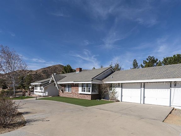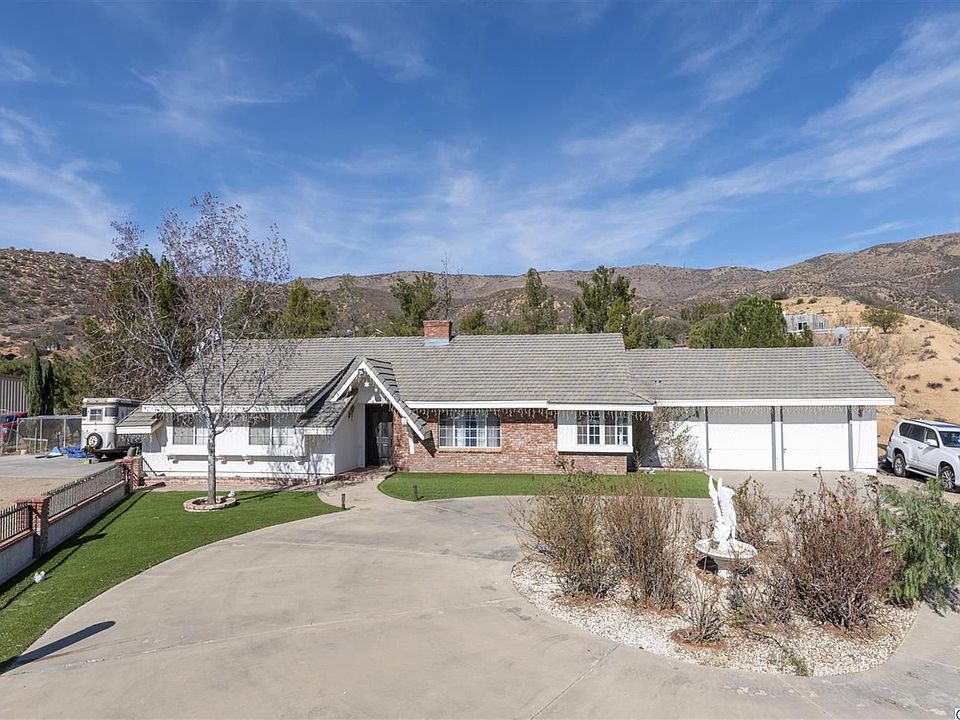 Astonishing mountain views surround this beautiful single-story custom built home, situated on over 3 acres of land. This 3-bedroom, 3bath Acton gem welcomes you with an inviting living room that boasts a floor to ceiling fireplace leading to the formal dining area. The granite kitchen countertops are accented by the bright recessed lighting & stainless steel appliances. The living room is seamlessly designed for entertaining as it is adjoined to the upgraded kitchen. The exterior of this home offers several small outbuildings, a two stall barn, a fully fenced backyard and a unique circular driveway.