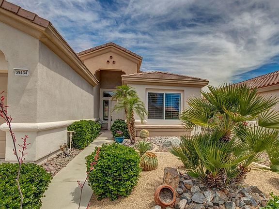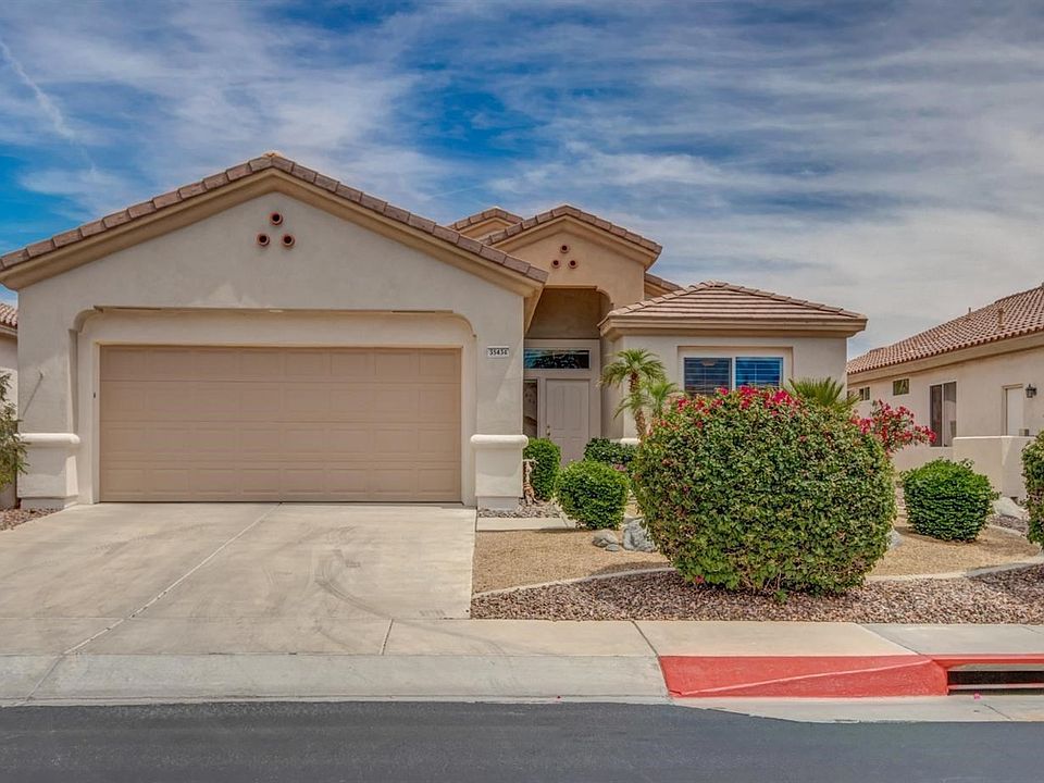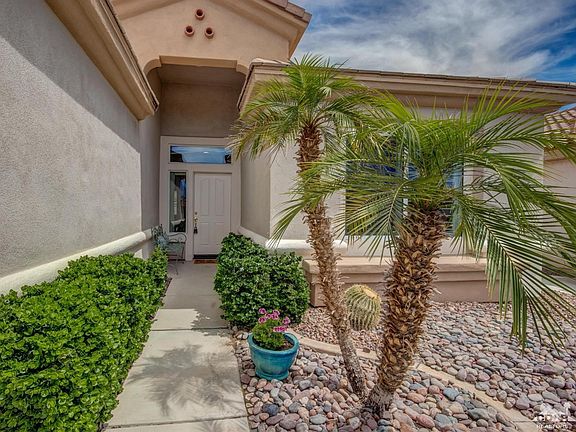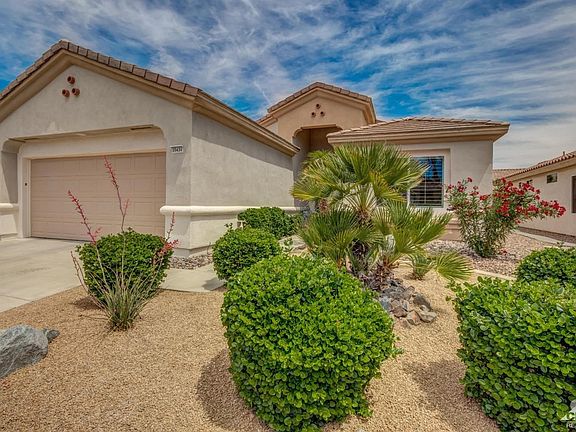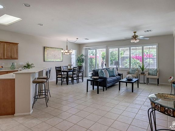 55+ Sun City Palm Desert. Popular St. Maarten model with 2 bedrooms and 2 baths. OPEN CONCEPT floor plan. Super private EAST facing extended patio with high wall, Alumawood awning, real grass and Meyer lemon tree. Tile in all rooms except the 2 bedrooms. All new bright and cheery interior paint in desert tones. Fireplace. Plantation shutters t/o. Upgraded raised panel maple cabinets. Solar tube in kitchen for extra light. Island/breakfast bar. Some newer appliances. Some newer fixtures. Living room and dining area are all tile. Master bedroom has bay window with black out shades, and bump out area for desk, bath has large shower with rain glass, walk in closet, dual vanity. Guest bath has soaking tub. Laundry room with washer and dryer included. Garage has evap. cooler, nook area for golf cart, workshop area and storage cabinets.