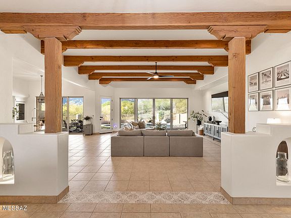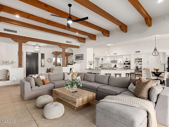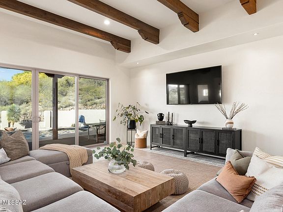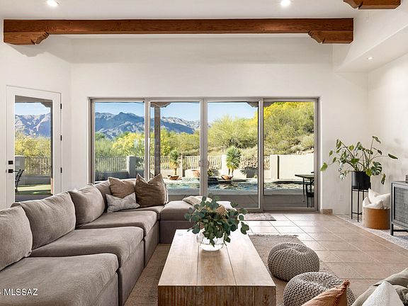 Fabulous open floor plan featuring walls of windows that showcase spectacular mountain views, soaring viga-beamed ceilings, beautifully appointed kitchen with breakfast bar seating, dining nook, gleaming ss appliances, white wood cabinets, custom lighting & built-in desk, opens to gorgeous Great Room with sliders that invite you to step outside to the deep covered porch, outdoor living & dining areas & sparkling pool. In a split plan, the primary suite feels like you've stepped into a spa, with a luxurious bath that includes a relaxing free-standing soaking tub, walk-in shower & premium fixtures. The guest wing connects via a striking jack-n-jill bath, & the den doubles as a 4th bedroom.The Seller made splendid improvements that made the whole property shine! In Gated Bella Catalinas Est!