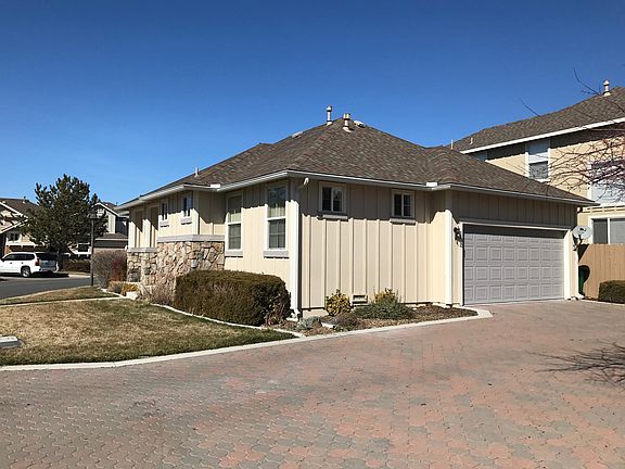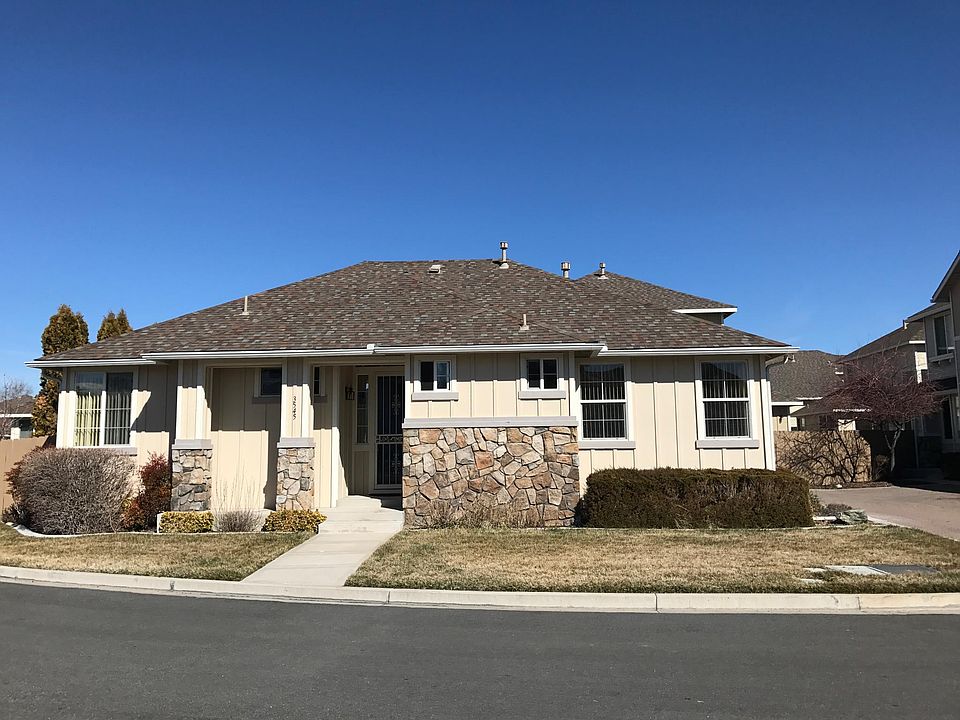 This immaculate single-level house is on a quiet street in Heron's Landing gated community. The home has been well-maintained and updated. It has vaulted ceilings, recessed lighting, a gas fireplace, travertine flooring, and carpeting in the bedrooms. The large master suite has a spacious closet, and the second bedroom is perfect for guests or office. All appliances (washer/dryer, microwave, and refrigerator) are included. There is a private, paved backyard patio and a fully landscaped front yard which is maintained by the HOA. Two-car garage with built-in storage space. Occupants are limited to a maximum of two vehicles as excess parking is limited; parking in the shared driveway is not allowed. You will enjoy the serene view of Mount Rose out of the front bedroom. The rounded "corner" lot has a large grassy common area on the west side of the home that provides additional space and privacy. Stroll the nearby walking trails along the lake and wetlands. Location is convenient for commuting anywhere in Reno/Sparks; it's just 30 minutes to the Tesla gigafactory and Mt. Rose ski resort! The owner pays for HOA, garbage, sewer, and taxes. The tenant has NV Energy and water in their name.