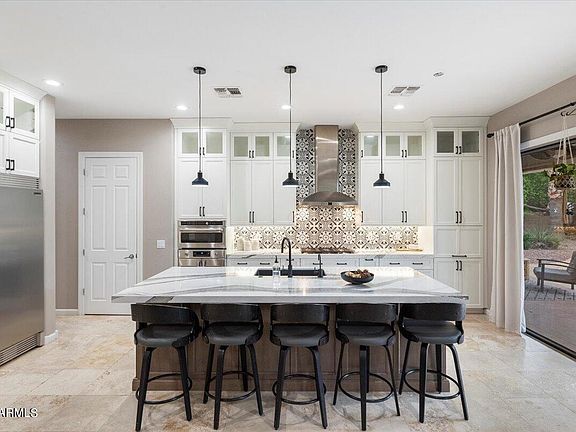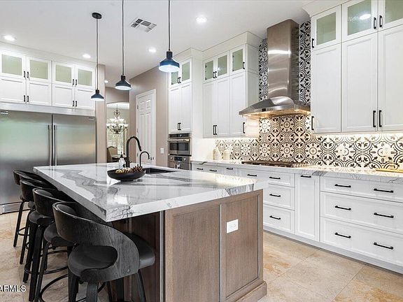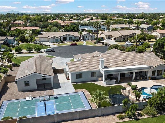 Beyond the community gates, nestled on a serene cul-de-sac lot, awaits a residence that epitomizes space and luxury. From the first glance, you'll be captivated by the array of amenities that this home offers, including a brand new guest house. This radiant ranch-style home welcomes you with an array of inviting spaces, including a formal dining area, living room, and a versatile den. The kitchen, recently remodeled to perfection, exudes magazine-worthy charm with its floor-to-ceiling white shaker-style cabinetry, a spacious wood-tone island with bar seating, luxurious quartz countertops, and top-of-the-line GE Cafe appliances including an oversized built-in fridge and freezer. Seamlessly integrated with the family room, adorned with a cozy gas fireplace and a built-in beverage center, the kitchen is an entertainer's dream. Boasting not one, but two owner's suites, thoughtfully separated from the other three bedrooms, this home offers unparalleled comfort and privacy. The primary suite spoils with dual vanities, a generously-sized tub, a walk-in shower, and an expansive walk-in closet. The second suite also impresses with its own walk-in closet and double vanities. The remaining bedrooms are equally spacious and enjoy the luxury of their own bathrooms. A newly constructed guest house beckons, boasting two bedrooms, two bathrooms, an open kitchen with a central island and new stainless steel appliances, a walk in pantry, garage, and a covered patio. Outside, the sprawling lot is a lush oasis, featuring citrus trees, a sparkling pool and spa, a built-in barbecue area, a sports court, a large covered patio, and ample space for outdoor enjoyment.