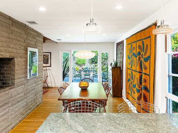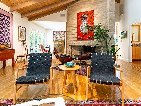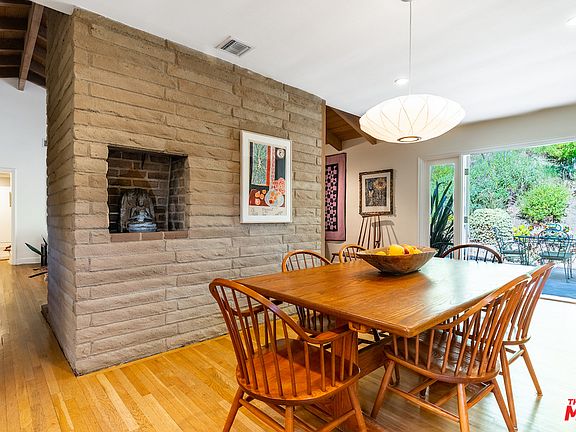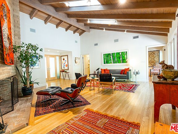 Open the front door and step into a tranquil oasis in Mandeville Canyon. Amid lush vegetation and citrus trees, this unique property boasts a lovely Ranch-style main house with attached two-car garage, and freestanding studio/office. The 2,140 square foot house has three bedrooms, three baths, a den, and an updated kitchen. A soaring beamed ceiling, skylights, hardwood floors, and a stone fireplace add to its Mid-century charm. French doors lead from the living room, dining room, den, and master suite to the garden. Pause for a moment on the patio over a cup of coffee or a glass of wine, watch hummingbirds dart in and out of lavender, listen to the morning birdsong and the gentle gurgle of the fountain. On the hill above the main house, a 415 square foot, architect-designed studio with half bath offers an inspiring, creative workspace with unparalleled views of the mountains and canyon. Welcome home to this peaceful retreat.