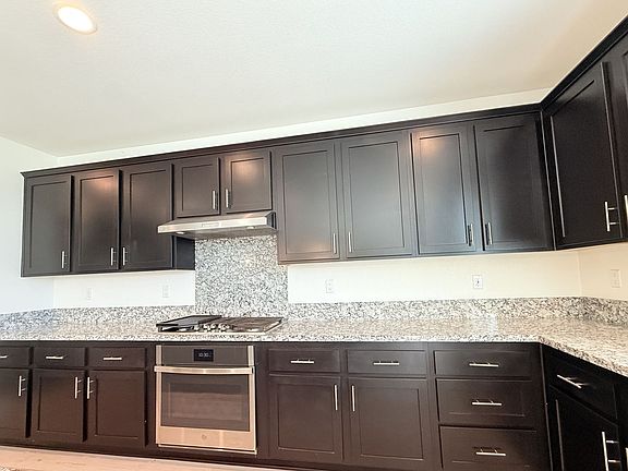 Granite kitchen countertops and stainless steel appliances complement the open concept design.