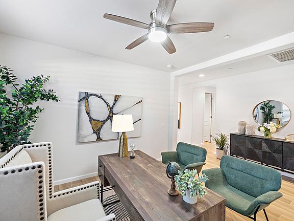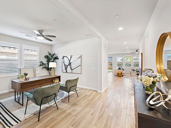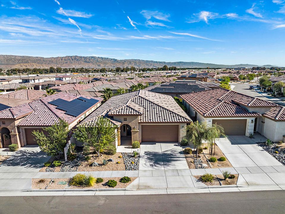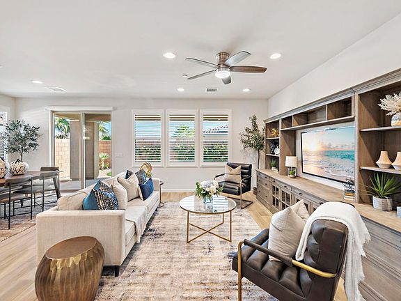 Stunning home debuting to the market and located in the wonderful gated community of Genesis in Palm Desert. This home is a newer construction, built in recent years, you will enjoy the flow of this beauty which is open, spacious, light, bright and in pristine condition. With three bedrooms, three bathrooms, den or formal dining room, has nice separation between bedrooms and is in move-in ready condition. The modern Core Plan 2 features include 9' ceilings, slab quartz countertops, wood-like porcelain tile flooring with upgraded carpet in the bedrooms, beautiful custom shutters throughout the home and Mountain Views from the bonus room. The modern kitchen has stainless steel appliances, island, pantry, lots of sophisticated cabinetry, and finishes, The master suite, has direct access to the covered backyard patio, bathroom is expansive with a large walled-glass shower, dual sinks and a nice size walk-in closet. The backyard is low maintenance with artificial turf and covered patio perfect to sit, read relax and enjoy your morning coffee. Kitchen refrigerator, stand alone wall shelving in great room, new washer and dryer will convey with property. Separate laundry room opens directly to a spacious two car garage which houses a tankless water heater. This walkable community has a low HOA of $166 per month, which includes resort style community pool, spa, gym, outdoor BBQ area, with sitting area and two dog parks. Perfect full-time resident, second home or investment property.