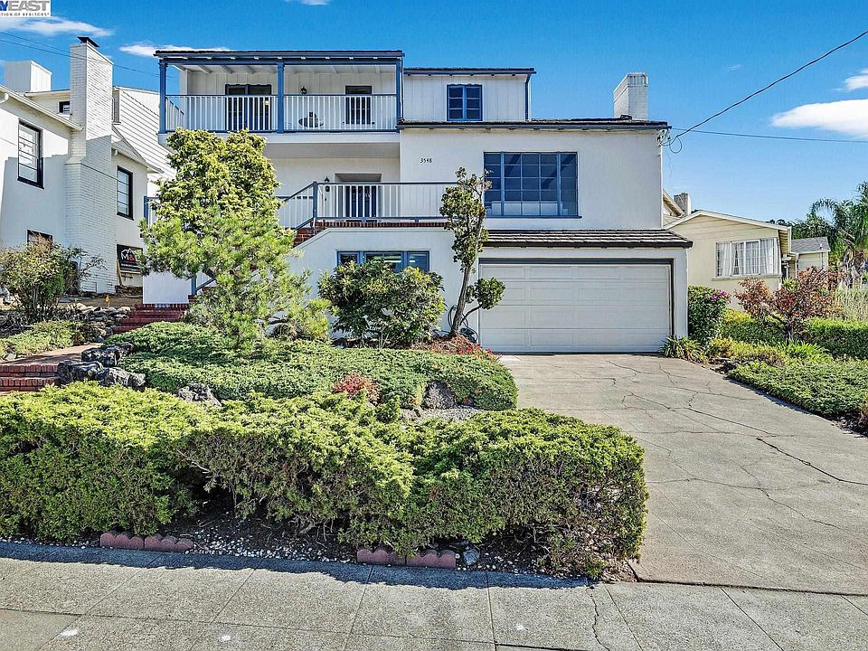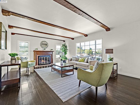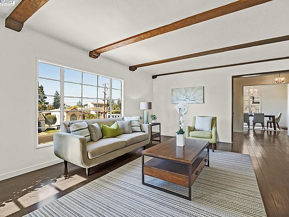 Welcome to this lovely two-story home located in the desirable Redwood Heights area of Oakland Hills! This property has plenty of natural sunlight streaming throughout. Relax in the enormous living room with wood-burning fireplace, decorative ceiling beams and oversized bay window. The expansive, mid-century, eat-in kitchen has a separate dining area with built-in cabinet and wood panels, complete with a spacious formal dining room and a gorgeous, crystal light chandelier. The covered balcony from the upstairs bedroom is for you to enjoy your morning coffee and evening sunsets! Admire the beautifully refinished hardwood floors throughout and freshly painted interior! The lower level has an extra room and bathroom with a private entrance that can be used as a 4th bedroom, home office or family den. In addition, there is also another bonus room from the garage that can be used as a rumpus room, gym, large storage room or possibly convert the lower level into an in-law unit. Additionally, there is a large laundry room with a workshop area. The sunny backyard has mature fruit trees and gets lots of sunshine for gardening. Moreover, the sewer lateral is in compliance. Conveniently located with easy access to Hwy 13, Fwy 580, and nearby Redwood Regional Park.