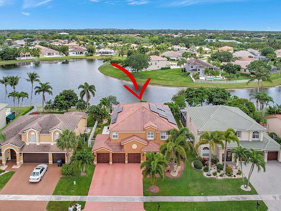 Luxurious waterfront living is yours in this magnificent Wellington residence in the coveted Grand Isles community! Discover a sophisticated interior defined by stately columns, stylized ceilings, and textured tile flooring. Double-hung windows surround the chandelier-lit dining room, sunlit breakfast nook, and fireplace-warmed family area with breathtaking water views. The gorgeous kitchen showcases handsome cabinetry, a pantry, and gleaming granite countertops extending to the large island. Your generously proportioned primary suite features an adjoining sitting room, an exclusive overlooking balcony, a walk-in closet, and an exquisite ensuite. Other notable are a laundry area, full house solar panels, and an attached 3-car garage. Come for a tour before this gem slips by!