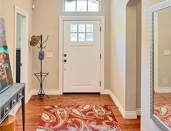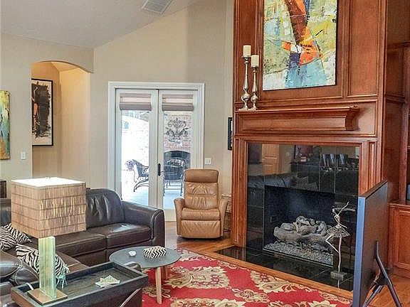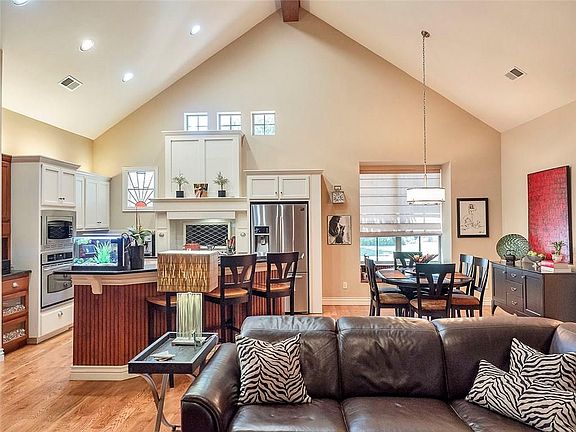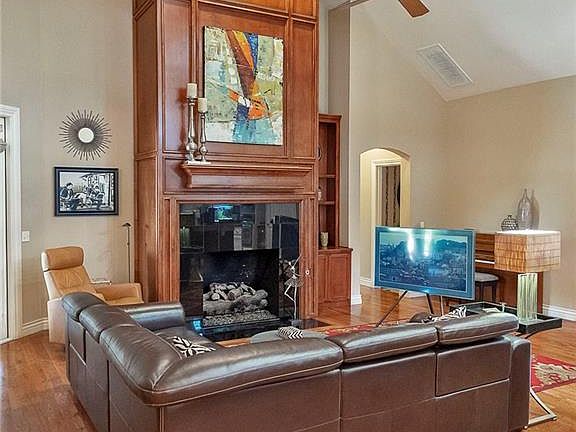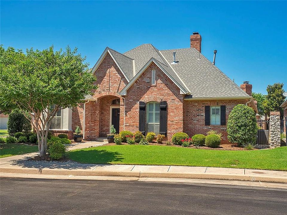 Simply beautiful home in amazing east Edmond gated community. Soaring ceilings in the open concept living, dining, kitchen features gorgeous hardwood floors, and a floor to ceiling fireplace. Kitchen has tons of counter space with an island/breakfast bar, farmhouse sink and stained glass window. The upstairs living room can serve multiple functions - 2nd living, bedroom, workout room, study. The master has French door access to the patio and features a stunning stand alone tub, double vanities and walk-in shower as well as the customary large walk-in closet.The huge covered patio offers a tranquil outdoor living space with a bubbly water feature to calm your frayed nerves after a busy day at the office. It also features a built in grill, fireplace and eating space. HOA dues include lawn care. .