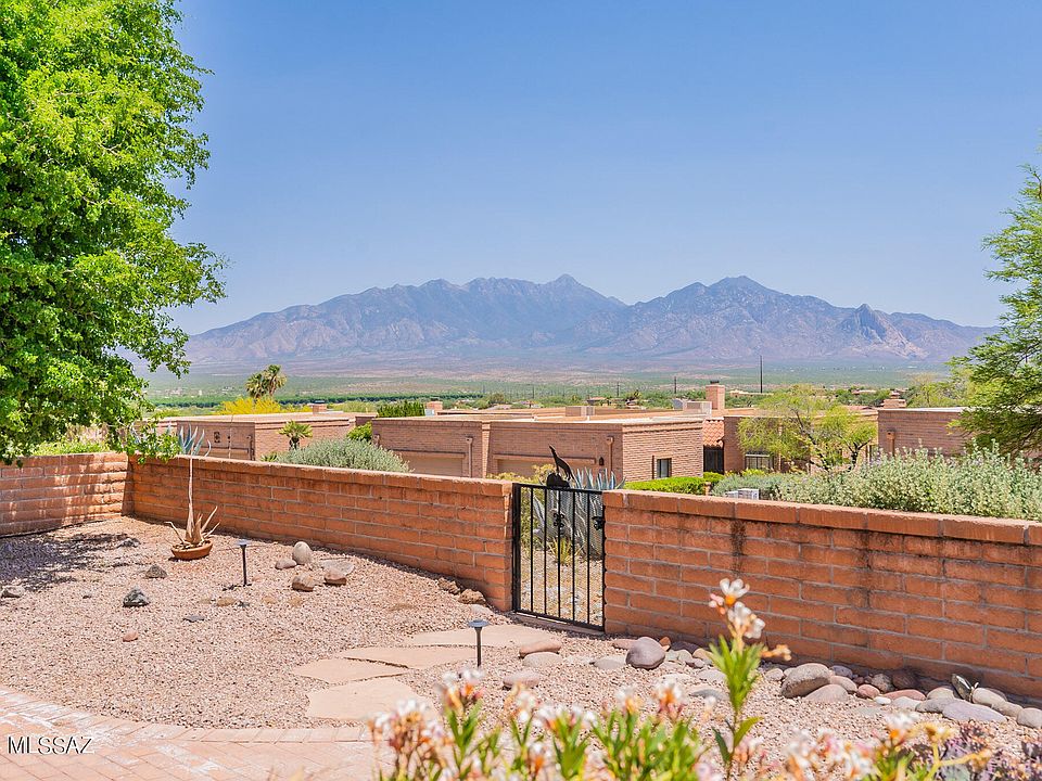 Santa Rita Mountain views. Spacious 2-bedrooms/2-baths plus den with a murphy bed. Arizona Room with 2nd murphy bed. Oversized 2-car garage. Arizona room provides your sunny office/TV room/hobby room & quiet tranquility. Amazing, close by Green Valley Recreation location with lap pool, hot tub, fitness center, theatre, artwork display by local artisans. Lots of storage & closet space. Quiet cul-de-sac location, end unit, surrounded by Pima County trails. Serene, private courtyard graces the entry. Easy-care front & back yard landscaping adorned with mature trees & low-maintenance desert plantings & shrubs. Back yard perfect for entertaining or quiet tranquility. Perfectly located on hillside lot. A blend of comfort, style & convenience! One owner home.
