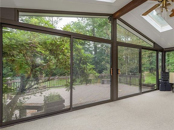 updated with a large island, an open eat-in area, large built-in cabinets, and a wall of windows to your private backyard. The large full bath has been totally updated with easy access from the kitchen area. Formal living room with a fireplace and a four-season room with all natural lights. The exterior has a wrap-around deck and patio area for your backyard enjoyment. The full bath is accessible from the master bedroom with plenty of storage. There is a full basement that would be easy to finish with additional living space. Great lot with plenty of privacy!