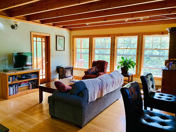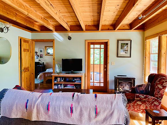 Custom home with lots of light in a beautiful country setting. Main home features two bedrooms, two bathrooms and open living, kitchen/dining area. Cathedral ceilings with tongue and groove wood, unique touches throughout. Second unit- perfect guest quarters or rental. Very private with one large bedroom, one bathroom and lots of natural light. 20 acres with creek running through it, large pond, horse barn and beautiful views of the valley.