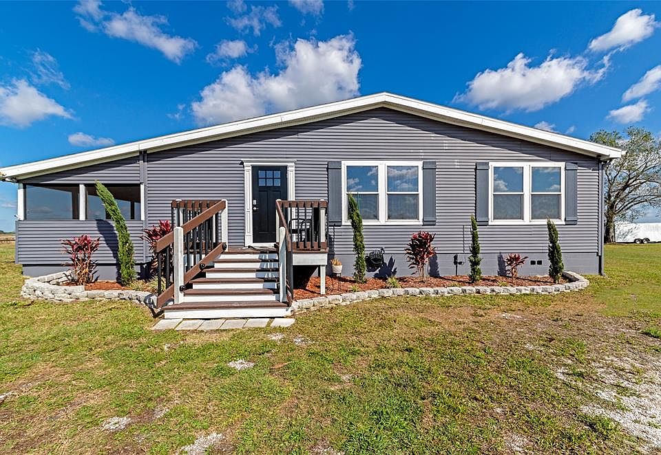 If seclusion and privacy is what you are looking for, look no more! This is country living at its best. No HOA, No deed restrictions and No CDD's! This 5-ACRE PARCEL is fenced and cross fenced for animals of your choice and includes a stocked, private pond. There is a detached, 33' x 20' workshop and a newer, 3 STALL BARN (12' x 34') with electricity. Plenty of room to roam and a brick paver bonfire pit entertainment area. 17 Palm trees grace the GATED entrance. Age of well is 2011, with Culligan water system installed on well 5/21. The well has been serviced and maintained regularly, as has the septic system. Upgrades are: new, electric gate(wi-fi enabled), recently painted exterior, newer front deck, A/C replaced 5/22, Roof replaced 12/21, new exterior door & trim, rescreened windows on home and tinted, newer barn.. Open and bright, Palm Harbor home. Home is updated with recycled composite flooring throughout great room and dining room. Corian counter tops, wood cabinetry and stainless appliances accent the kitchen. Split floor plan with large Master suite. Third bedroom has French doors and can be used as office or den. Inside laundry room w/ sliding barn door,& bi cabinet. also leads to attached, screened 10 x 48 side porch where you can enjoy reading a book, or sipping Pina colada's. Move-in ready. Lovingly kept and ready for you and yours. Have it ALL and have NONE of the busyness of city life. Bring the animals and the family. Within 20 minutes of Publix, Myakka State Park, Bearparadise, Hunsaders, TreeUmph, Lake Manatee Park, and Fiorelli's Winery. Lots of fishing, kayaking, paddle boarding, and biking and close to dining. A rated school district.