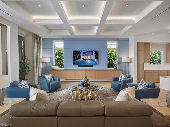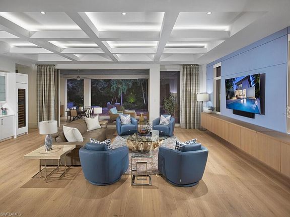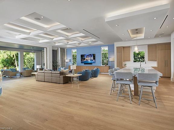 Nestled in the heart of Old Naples, just three blocks from the beach and steps away from world-class shopping and dining on 5th Avenue and 3rd St South, this custom, newly built London Bay home is ideally located on a peaceful street. The open floor plan showcases luxurious finishes and attention to detail throughout. The spacious kitchen features a 13-foot island and an expansive walk-through pantry, complemented by rift oak and high-gloss white cabinetry that harmonizes beautifully with the wide plank oak floors. An open formal dining room and expansive great room with a bar flow effortlessly through pocketing sliding glass doors to a covered outdoor living area. This outdoor oasis includes a fireplace, an outdoor kitchen, automated screens, pool, a tranquil pond and water feature, and a beautifully designed private garden shower. The second floor is home to two guest suites, a comfortable bonus room, and the primary suite, which boasts two walk-in closets and a private balcony overlooking the tropical yard. Additional noteworthy features include a 3-car garage, an elevated generator, air-conditioning units, and tankless water heaters, all with the convenience of natural gas serving the property.