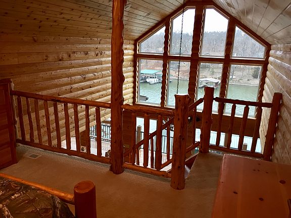 Two year old custom lodge style home with 5 bedrooms, 3 baths, 2 car garage. Custom bath vanity, walk in showers with teak shelves, plenty of room on lower level for pool table and game room, walk in pantry, french doors to sunroom, granite counters, stainless appliances. Two slip concrete dock with 4500 and 7000 lb. boat lifts in no wake cove. No maintenance decking and rocked yard. Cove location with main channel view on approximately 3/4 acre with 120' lakefront. Plenty of extra parking for guests. HOA includes community water and sewer. Dock includes fish cleaning station with fresh water, storage unit and easy step ladder. Most custom made Amish furniture negotiable.
