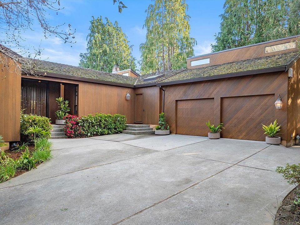 Welcome to 355 Alberta Way, a custom sanctuary in Hillsborough's Carolands neighborhood. This stunning home boasts a contemporary design with tongue & groove clear-all-heart Redwood siding. It is set on a mostly level half acre lot. This expansive single level floorplan, features a large living room, with soaring ceilings, clerestory windows, bay views, a stunning fireplace and a full-service bar for entertaining. The expansive Primary Suite includes bay views, all the way to Mt. Diablo, high ceilings, walk-in closet and a luxurious bathroom with a soaking tub. Two additional bedrooms with a shared bath complete the bedroom wing. The formal dining room is adorned with parquet flooring and silk wallpaper, leading to an updated kitchen, breakfast area and family room all with patio access and fabulous views of the lush garden and sparkling pool. There is also a large poolhouse with wet bar and full bathroom for fun summertime parties. There is a large flat garden area awaiting your vision. Additionally, next to the family room is a large, en-suite fourth bedroom, which would be a great in-law, au pair, or office.