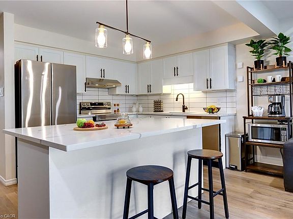 Welcome to this lovely renovated townhome located in the Silver Heights area of Hespeler. Here you are within walking distance to trails along the Speed River and downtown Hespler with its quaint shops and restaurants. This 3 Bedroom, 3 Bath Freehold townhome is move in ready, has been freshly painted and updated throughout including a new furnace and heat pump. Neutral vinyl floors run throughout the home giving a seamless flow to the spaces and provides easy maintenance for those with children or pets. The open concept main floor kitchen/living room area features a large island with seating for 3, pot lights and sliding door to the deck. The stunning marble look quartz counter top and subway backsplash compliment the stainless-steel appliances. For convenience, there is a 2-pc powder room on the main floor and a 2-pc bathroom in the basement. Make your way upstairs to the private area of this home. The large primary suite has a walk-in closet. Two other bedrooms and a renovated 4-pc bathroom complete the second floor. The full basement has an open space that can be extra entertainment space or a home office. The utility/laundry room has ample space for extra storage. Although this is a freehold townhome, you never need to worry about cutting your grass. Close to highways, Regional Waterloo International Airport, golf courses and much more, this is an ideal location.