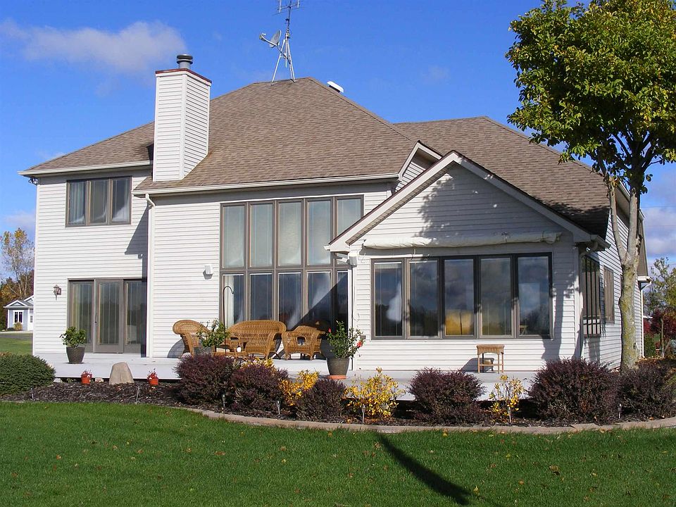 The views from the tri-level composite 50 ft. long deck are surpassed by none. The large lakefront yard with a firm beach is a great place to gather and enjoy all types of water activities on this all sports lake. The 4 season sunroom is enclosed on three sides with windows to maximize views year round. The sunroom also has a awning on the outside wall that can be rolled out for shade for those who want it or need it. This meticulously maintained 3 bedroom 2 1/2 bath home could be converted to five bedrooms with a few modifications. This home has a very open feeling with cathedral ceilings in the great room and open staircase adjoined to the dinning/kitchen/foyer area with surround sound for most of the main level . The combined dinning/kitchen area with abundant hickory cabinets and granite counter tops which lend themselves to a warm, friendly atmosphere for friends and family gatherings. The master bedroom suite can be entered through a sliding door from the deck which also provides a great view from your bedroom. The quite large master bath includes a double sink vanity along with a garden tub for soaking plus a shower with bench and also large walk-in closet. Upstairs has two bedrooms and a full bath with a loft area that could be converted to a 4th bedroom. There is also a .34 acre back lot across the street with a 900 sq ft. extra garage for storing boats and other water toys. The septic has been maintained with the system being pumped and inspected every two years.