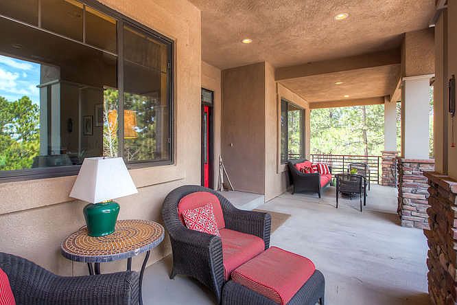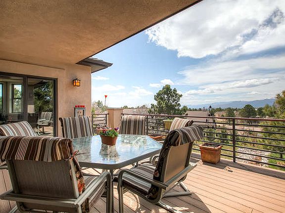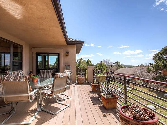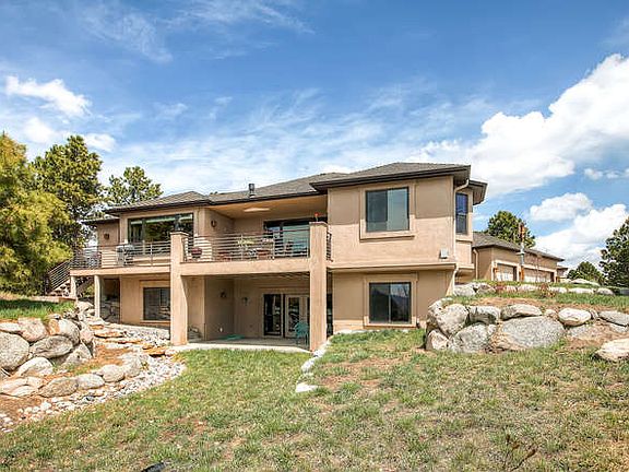 Spectacular custom stucco and stone Craftsman style home on a fabulous private treed lot with unobstructed views of Pikes Peak and the AFA! Charming covered front porch, Pella fiberglass windows, spacious great room w/ a wall of windows to soak in the amazing views. Main level also includes vaulted ceiling, stone gas fireplace, built-ins, formal dining room or office on main, gourmet kitchen with tile floor, ash cabinets with a licorice wash, soft close drawers and pull-outs, built-in buffet, large pantry, generous eating nook w/ built-ins and walk-out to partially covered composite deck with iron railing, main level master w/ views, tray ceiling, attached 5 pc bath with air jetted tub, secondary bedroom or office on main w/ attached 3/4 bath. There are two additional bedrooms in walk-out basement with Jack & Jill bath, large workshop area and family room. A must see in move-in condition!