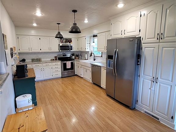 Beautiful home on 1.15 acres convenient location just outside town with lots of trees making this your own private oasis. Mature trees, covered deck, shade and plenty of space for a garden, flower beds or just room for the kids to play. The cook of the family will love this kitchen with custom cabinets, tile backsplash, beautiful counter tops, sink and lighting. Finished basement provides a wonderful family room perfect for kids to play or just family recreation area.