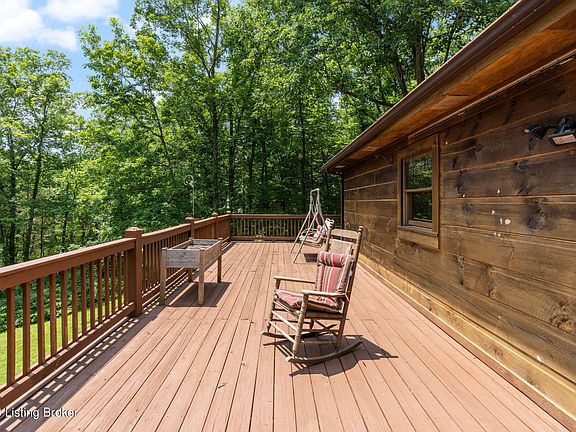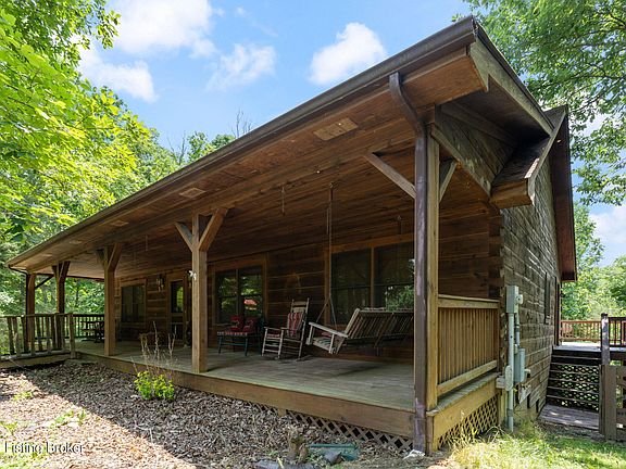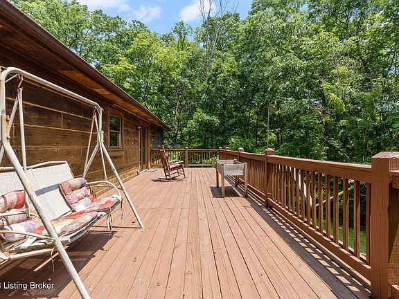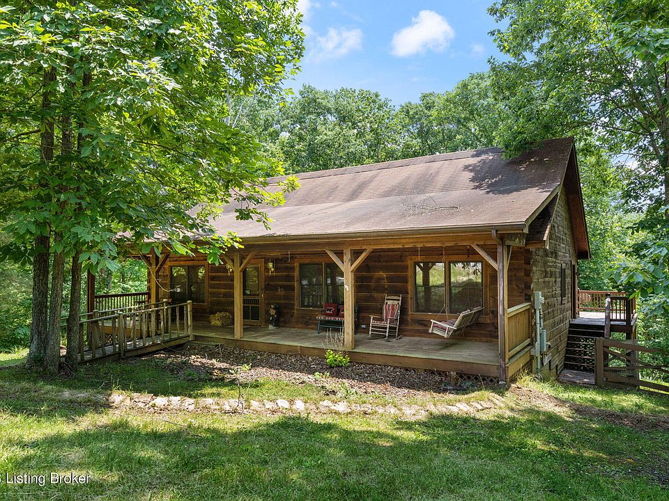 Secluded, peaceful and quiet. This log home is surrounded by nature and offers the feeling of living in a vacation home that you can live in year round. The front door opens up to a wide-open floor plan with tall vaulted ceilings. The spacious living room contains a built-in propane fireplace. There is rustic wood trim around all windows and doors. The living room flows to the dining area and long, roomy kitchen. There are lots of stained wood cabinets to store everything you need. The floor plan is split with the large primary bedroom being located off to the right of the living room. There is a walk in closet and en-suite full bath. The two other nicely-sized bedrooms are located on the left with a full bath located in between them. There are two hallway closets and a large coat closet. Paneling is already in place in the unfinished walkout basement. There is plumbing roughed in for a 3rd bathroom. The front of the home features a wide, covered front porch on which to enjoy all seasons. The back deck is huge and wraps around the home to the side door. The property includes a cleared back yard and acreage of wooded area for incredible privacy. The back deck is completely private and just right for a hot tub. There is nearby Taylorsville Lake state park which includes a boat ramp and riding trails just 5 minutes away. There are deer, wild turkey and other wildlife on and all around the property. Log cabin homes like this are hard to find. Come see this unique and tranquil log cabin home before it's too late!
