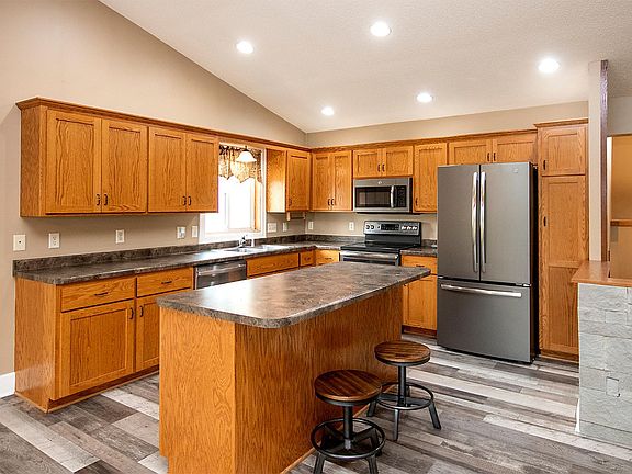This "Move In" condition home features a large foyer with granite flooring, center island kitchen with stainless steel appliance included, patio door leads to large deck off the dining area, open floor plan with vaulted ceilings, living has a gas fireplace, primary bedroom with walk-in closet and walk-thru bathroom. Lower level has a family room with lookout window & gas fireplace plus 2 additional bedrooms and bathroom with granite flooring. Radon mitigation system, oversized 2 stall garage is finished & heated.