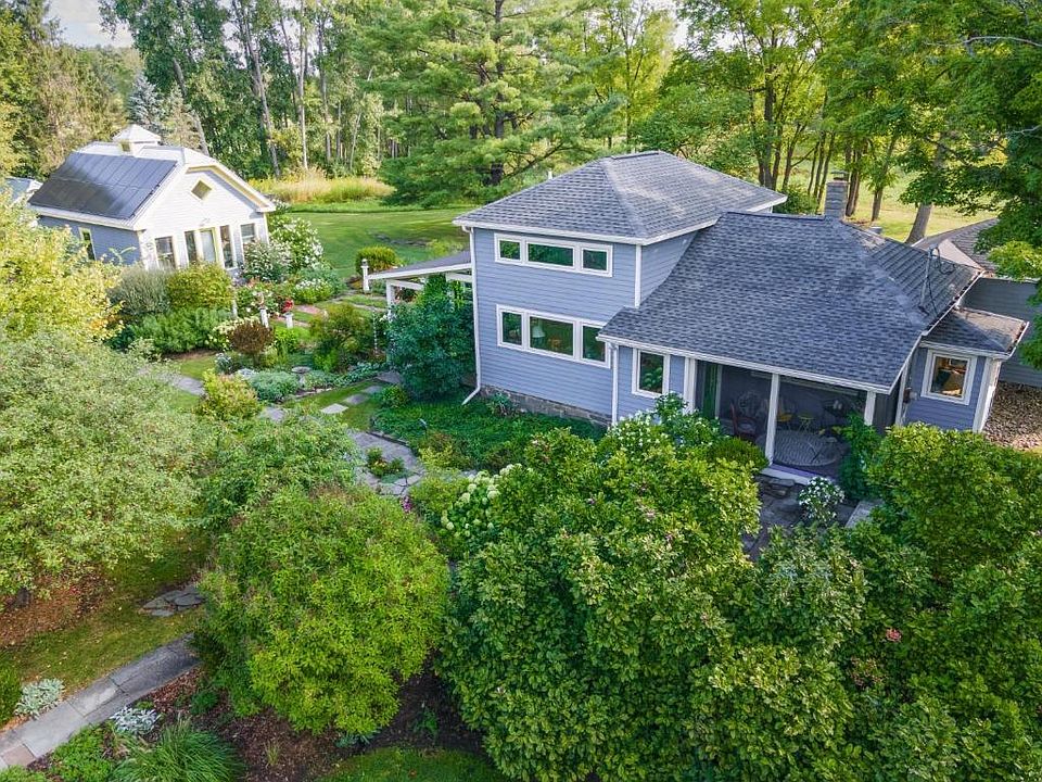 This lovingly renovated home and studio/office in an exquisite setting is a rare gem. The contemporary feeling home features a new custom kitchen, vaulted living room with fireplace, new 1st floor primary bedroom and tile bath. Recent energy upgrades include improved insulation and windows, and heat pump for forced air heating/AC. The studio (an additional 543 SF) has large windows, custom cabinets, spiral staircase to loft, & separate workshop. Enhanced comfort w/AC mini-split, solar panels, radiant floor heat. Outdoor living spaces abound with magnificent porches, stunning gardens, stone terraces, hot tub patio, artisanal pizza oven, veggie garden, lily pond and more: all designed by the landscape architect owner. Live the good life here, within walking distance to the remarkable village of Trumansburg too. Come enjoy the quality and beauty of it all!