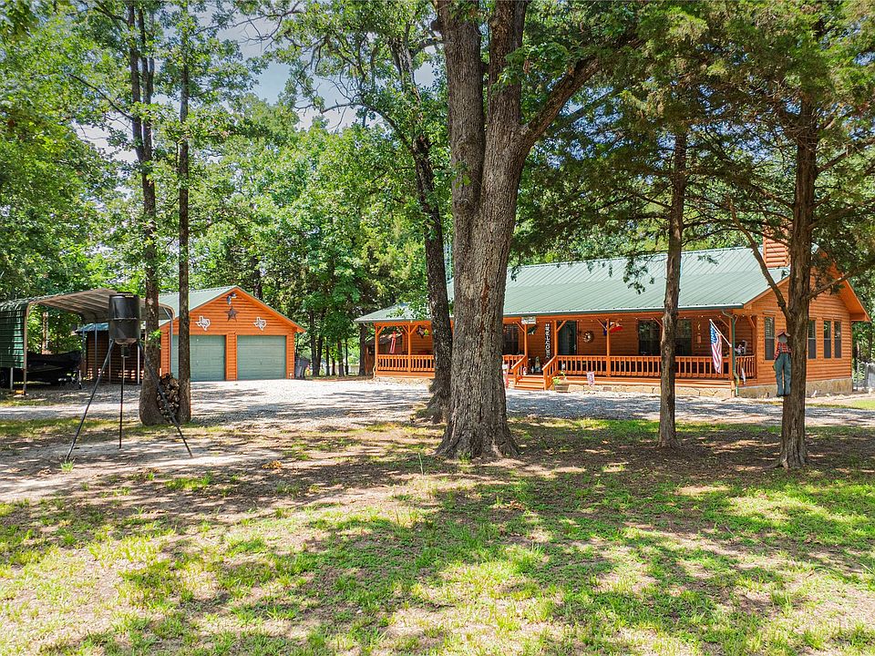 Welcome to this warm and inviting ranch style log cabin in the desirable North Shores community at Lake Fork. The drive in views are breathtaking! Set on a full acre surrounded by natural beauty & abundant wildlife, this 3 bedroom 2 bath home is the perfect retreat for those who love nature and lake living. With a circular driveway, detached 2 car garage, and a covered boat carport, it is ideal for storing lake toys. Inside you will find stunning tongue and groove wood throughout the interior, including the walls & ceilings, creating a cozy, cabin-style atmosphere in every room. Enjoy cooking and gathering in the charming kitchen, complete with granite countertops and adorable island. Additional office provides flex space for remote work or hobbies, while the large screened-in back porch & expansive covered front porch offer plenty of room to relax and take in the peaceful surroundings. While this home is not directly on the water, it’s located in a lake-access neighborhood with a community boat ramp just minutes away!