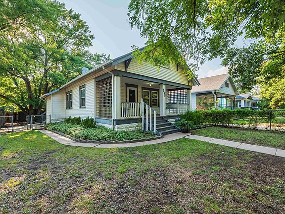 NEW ROOF TAMKO RUSTIC BLACK & GUTTERS ON HOUSE COMING SOON. Take a look at this cute 2 bedroom 1 bath home with its LARGE COVERED FRONT PORCH WITH SWING THAT STAYS. TONS OF ADDITIONAL POTENTIAL in this home as you will see when you are inside. On a CORNER LOT you will enter through the FULLY FENCED front yard to the charming covered front porch that would fit additional porch furniture if desired. Enter home with TILED ENTRY to find a nice size living room, large dining room that will FIT A LARGER DINING TABLE and 9' CEILINGS. The kitchen has a nook for the fridge w room for small table under window. The kitchen holds a dishwasher, stove/oven, microwave & disposal. There is a small movable cabinet on wheels that can be used for additional counter space & storage that stays. The mud room is just off the kitchen with wood floors, shelving, plant stand that stays and door to back yard w/ dog door. The two bedrooms are located off the dining area and has a cute full bath between with a window letting in nice natural light. One of the bedrooms has a walk in closet with built in shelving & a door to the living room should you want to make it an office. The other bedroom has multiple windows that over look the back yard & side of home. The basement although unfinished has potential and has a separate dedicated entrance door that lead to stairs to basement. There used to be another non conforming bedroom, full bath and small kitchenette in basement in past years. The tub/toilet, old stove/oven is still in place but not warrantied or guaranteed by seller as it has not been used in over 9 years. DO NOT turn on basement appliances to check them for safety reasons please! New owner can investigate during their ownership. The laundry is located in the basement but could "possibly" be moved up to the kitchen or mud room if so inclined. The 2 car detached side load garage is a huge plus and could function as a work area or storage. The middle beam makes for possible small car entry but would need to be removed to get larger car in. The garage needs some work but again, great space and great potential. There is electrical in garage. The fully fenced yard front & back belongs to seller on all sides. Plenty of room for a playset, grill or to expand garage if so inclined. There is a concrete paver walkway from front to back with landscaping bed. Nice mature trees provide great shade and one of them would be fun to add a tree house. There is an alley behind yard next to garage. There is an entrance door to mud room with dog door AND a separate entrance to the stairs to basement. TONS OF POTENTIAL in this home if so inclined or live in it just the way it is. Three yard gates exist on property: one to front yard and entrance, one between front yard & back yard area and one from sidewalk that goes to garage to back yard area. The location can't be beat with easy access to downtown, Wesley hospital, East Wichita, Kellogg, grocery, wonderful restaurants and shops. This home is being sold "as is"/current condition, CASH OR CONVENTIONAL LOAN ONLY. Buyer/Buyers agent to do their due diligence as this home has been a rental for the last 9 years. UPDATES TO NOTE: 2024 NEW ROOF ( Rustic Black ) AND GUTTERS ON HOUSE COMING SOON, NEW DISPOSAL 2022, NEWER VINYL WINDOWS installed 2009 throughout home on main floor, HVAC installed 2013. Hot Water Heater installed 2016-17 ish. Do not wait to see this home and all the great potential it has to offer!