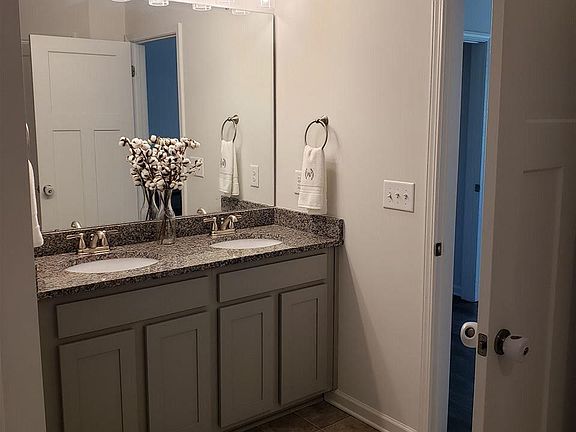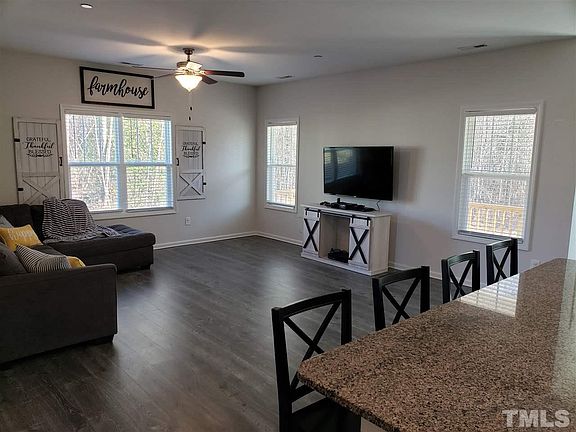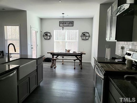 Open floor plan features large living room, open kitchen with an island and porcelain farm style sink, upgraded glass range hood and tile kitchen backsplash. Breakfast room off the kitchen leads to the back porch. Master bath features beautifully upgraded shower with glass doors and tile. It also has a double sink vanity and a water closet for privacy. The large workbench in the garage stays.Large walk in closet in the master bedroom. Large cul de sac lot cleared with some trees in the rear for privacy.
