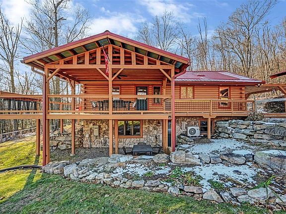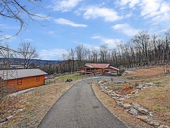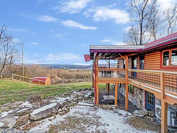 VIEWS AS FAR AS THE EYE CAN SEE! ONE-OF-A-KIND 3BD/2.5BTH Log Ranch blends rustic charm with contemporary flair boasts 2100sf+ of living space on 2 levels and sits on 5.10 private tree-lined acres! The open floor plans' abundant natural light pours through lg windows. The vaulted ceiling skylights highlight the exposed beams and wood interior throughout! Relax fireside with the mid-century wood fireplace in the Living room, while dining, or in the Kitchen with granite countertops and tin backsplash. Modern baths and spacious Bedrooms with views complete the 1st floor. A walk-out Lower Level is an open canvas and makes a great Family Room, In-Law Suite, or Game Room complete with a Bedroom & a full Bath with custom tiled shower! The ¾ wraparound partially covered deck is ideal for entertaining and enjoying the panoramic views! SOLD TURN-KEY W/ NEW FURNITURE! Detached garage, fenced yard with dog run and a detached LOG CLUBHOUSE with covered porch too! New HVAC, Central Air, mini-splits, & generator! NO HOA & NO DUES! SEE OUR VIRTUAL TOUR!