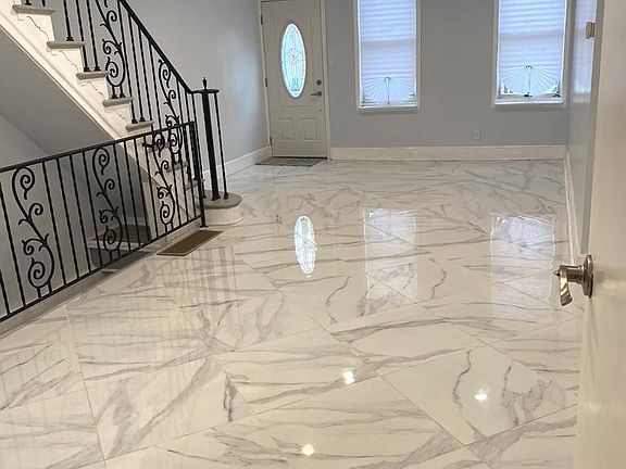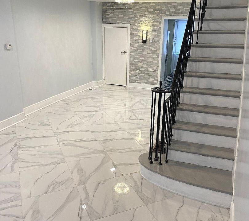 Fully finished basementMounted microwaveDesigner backsplashGray shaker cabinetsSouth philly brick frontBrand new wooden porchLarge skylight