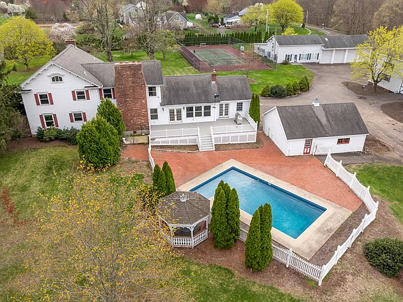 Well-Designed Compound Offering Security, Space, and Limitless Potential! This exceptional 2.71 acre estate offers the perfect balance of privacy, convenience, and versatility within a beautifully planned compound. At its center is a massive three-story barn with 3-phase electrical power-originally a dairy farm, now a commercial-grade contractor's workshop, ideal for a wide range uses. The main Colonial-style residence spans over 4,192 sq. ft. and features a remodeled chef's kitchen with cathedral ceilings, granite countertops, Sub-Zero refrigerator, range, double ovens, and an oversized eat-in area.The open floor plan extends to the deck, pool, and gazebo, ideal for entertaining. Inside, you'll find custom woodwork, coffered ceilings, elegant fireplace mantels, substantial moldings.Oversized windows provide natural light and scenic views.The first-floor primary suite includes a full bath, walk-in shower, + walk-in closet. Upstairs offers three more bedrooms,including another primary suite w/ fireplace, full bath, walk-in closet, & laundry. Outdoors, enjoy, tennis court, detached 2-car garage (main house), city water,private irrigation well for lawn, functional circular drive w/ back gate . The 4th detached building, formerly an 8-bay garage-transformed into a spacious 960 S.F private office/dwelling with 4 rooms, 2 full bathrooms, and a fully equipped kitchen for guest quarters or a home office plus additional full bay garages. Come see! "As Is Rider" must accompany offers.