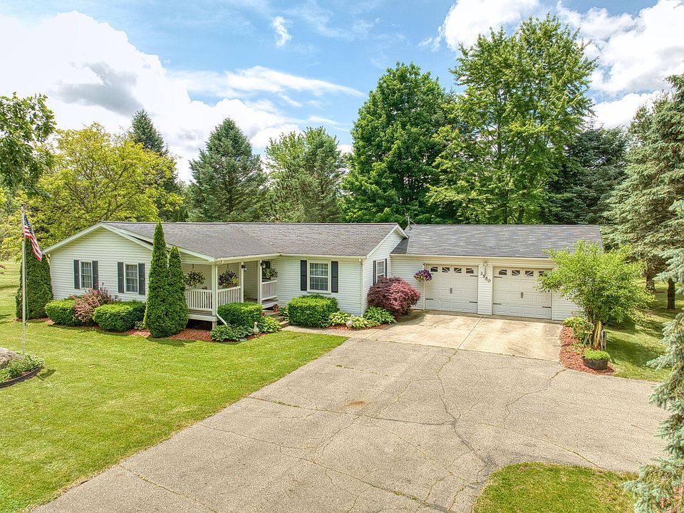 Welcome to your dream home! Nestled on a serene 3-acre lot with mature trees, this beautiful ranch home offers a park-like setting with picturesque views of the golf course and a pole barn. This property is a true gem, boasting numerous amenities and ample space for comfortable living. Step into the spacious vaulted great room, perfect for entertaining guests or relaxing with family. Enjoy the convenience of a main level laundry room, spacious primary suite features an expansive walk-in closet, built-in linen closets, and an en-suite bath for ultimate privacy and comfort. Second Bedroom is Ideal for guests or family members with its own private bath. The 3rd non conforming bedroom is currently used as an office. The full finished basement provides additional living space, including a large family room with charming cedar paneling and a non-conforming fourth bedroom. This home offers abundant storage options, ensuring you have plenty of space to organize your belongings. Relax on the covered back patio or the front porch offering stunning views of the golf course. The impressive 40x64 pole barn is equipped with radiant heat, electric, water, and a 200 amp service, making it perfect for various uses. Enjoy the benefits of natural gas, eliminating the need for propane. Easy commute being just a couple minutes from the highway whether traveling to lansing, Kalamazoo or Ann Arbor.