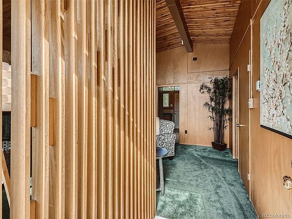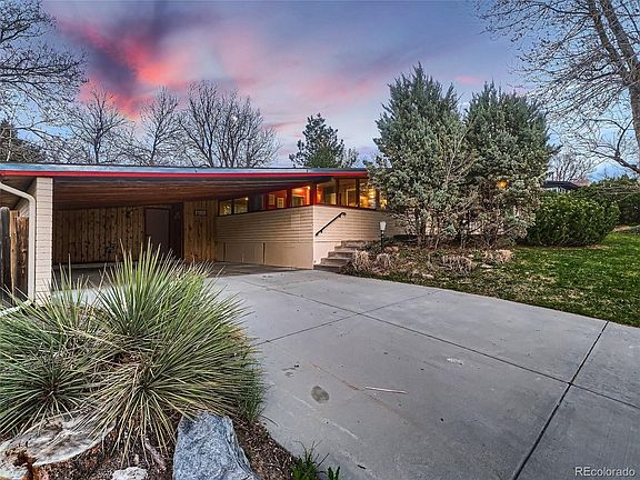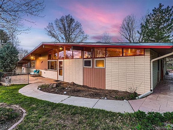 Enjoy breathtaking sunsets from the front porch of this mid-century modern gem in Applewood! Upon walking through the front door, you'll know you've found something special! The living room and family room share a double-sided gas fireplace. The open-concept kitchen has updated cabinetry and countertops but retained the original flooring! The dining room has a built-in buffet. Spend hours in the game room playing pool or ping pong. The primary bedroom suite has an en-suite 3/4 bath. There are 3 additional bedrooms, one of which makes a great art studio or craft room. A full bath and the laundry/mechanical room with built-in office space complete the floor plan. Upgrades include the sewer line in 2013, boiler in 2014, roof in 2017/18, and water heater in 2021. 2-car carport with attached storage. The backyard is an entertainer's dream with multiple patios, a fire pit, and a pond with a waterfall. The front yard has a sprinkler system, and the gardening beds are irrigated. The garden shed is heated by a pellet stove and also has electrical and a skylight. Experience all that Applewood has to offer! Shop and dine in Applewood Village, Colorado Mills, and Denver West. Enjoy recreational activities at the Wheat Ridge Recreation Center. The newly developing Clear Creek Crossing will be the home of the new Lutheran hospital and Lifetime Fitness. Great schools including the newly built Prospect Valley Elementary. Commuting is easy with nearby light rail stations and convenient highway access.