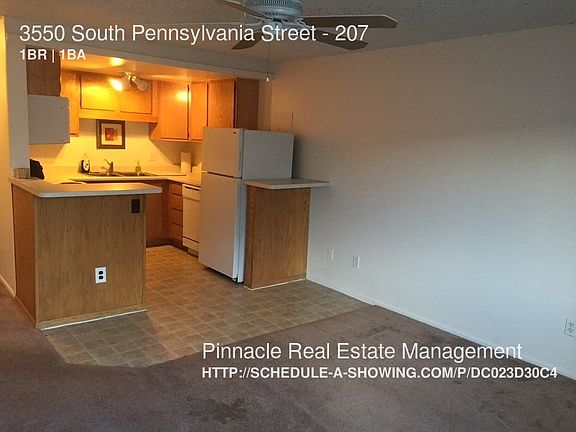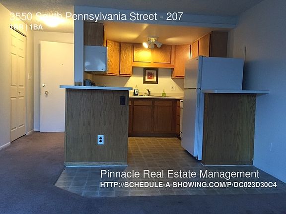 SCHEDULE A SHOWING ONLINE AT: showmojo.com/lh/dc023d30c4 One Bedroom Apartment in Englewood: Remarkable Value - Unbeatable Location - 5 Minutes to Light Rail by Car -Free off-street parking -Grocery store within walking distance -Fireplace -Large onsite laundry facility -Dishwasher Available: February 10, 2017 3550 South Pennsylvania Street #207 12-Month Lease $850 Rent $50 Flat Monthly Utility Fee (covers use of water, trash, gas, wastewater discharge, and heat) TENANT billed independently for metered electricity use through Xcel Energy $400 Security Deposit $45 Application Fee (per person) No Pets, Please! Thank you very much for your time and interest!