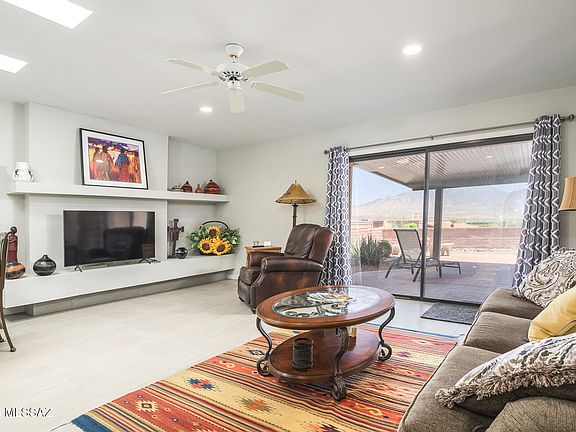 Absorb yourself in awesome, non-stop mountain views from this dazzling remodeled townhome. It's all new from top to bottom in this trendy, furnished home. And, now it's solar powered with an owned system sending power back to the grid for TEP credits and a monthly bill of less than $24. The most expensive aspect of this renovation was the creation of a great room and with it a fantastic new kitchen. The focal point being a quartz topped island/breakfast bar surrounded by crisp white cabinets, sparkling Stainless Steel appliances and more quartz counters, illuminated by abundant natural light. Stylish rectangular 18x36 tile embellishes the entire dwelling accented by white baseboards, fresh paint and quartz executive height vanities in both baths. Step outside from the great room or primary bedroom to a super private rear patio overshadowed by a spectacular view of Madera Canyon and Elephant Head. An extended patio with pavers and a ramada plus desert plants guarantees minimal maintenance and water usage.