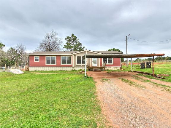 Looking for a home for your horses? Plenty of space for you too! Perfect for equestrian enthusiasts. This 10 acre property boasts a spacious 3-bedroom, 2-bathroom home surrounded by natures beauty. Split floor plan with an ensuite primary bathroom that includes dual sinks, separate shower and garden tub. Open concept kitchen and living area. Three horse pastures with a three-stall shed located in the big pasture and one-stall shed in the others, and a corral. A serene spring feed pond adorns the back pasture. The property includes a carport and a storm shelter for your peace of mind. Although privacy is ideal, so is convenience for commuters and proximity to Shawnee for shopping and dinning. Property like this is hard to find, don't miss it!