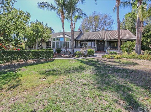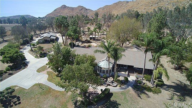 Stunning 4 bedroom 3 bathroom 2784 square foot single story custom home on fully paid solar in West Hemet accompanied by a nearly 3000 square foot barn as well as additional guest quarters on an enormous 4.88 acre lot. This highly upgraded homes has custom paint throughout. The formal double door entry opens to the living room with hardwood floors and vaulted wood beam ceilings. There is a floor to ceiling double side brick fireplace with wood burning stove on the other side. Living room also has sliding door access to the sun room which boasts amazing views of the San Jacinto mountains. The formal dining room has a beautiful chandelier with additional sliding door access to sun room. The kitchen is simply breathtaking with granite slab counters. There is an informal dining area as well as a large kitchen island with seating for at least two and the gourmet kitchen includes a double built in oven, island cooktop with additional sink, dishwasher, built in microwave and plenty of cabinet and counter space. The master bedroom is huge with single door access to the covered patio in the backyard. The master bathroom has granite slab counters and travertine floors and tiled jetted tub with separate walk in shower. There is a very large walk in closet with built in closet system. The hallway bathroom has also been remodeled with granite counters, travertine floors and tile. The grounds on this property are huge providing endless opportunities for horses, agriculture and more.