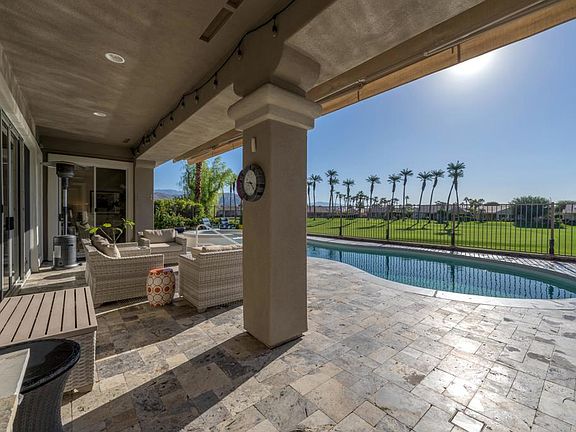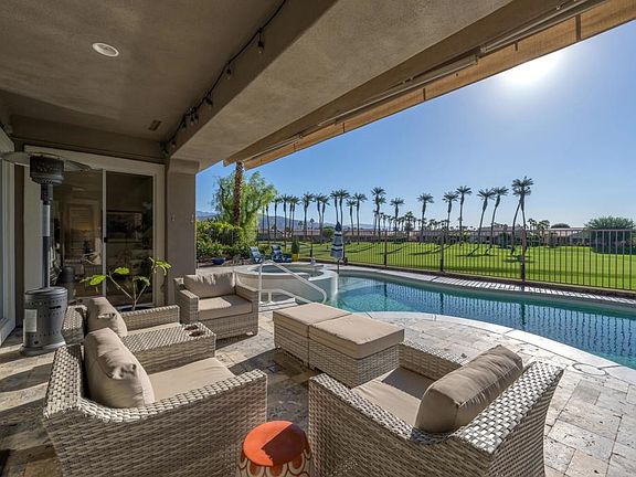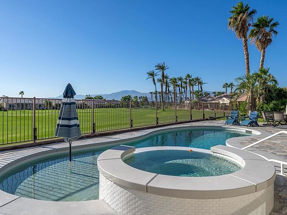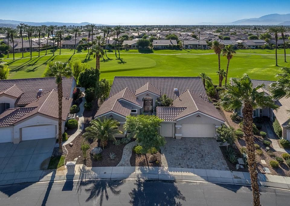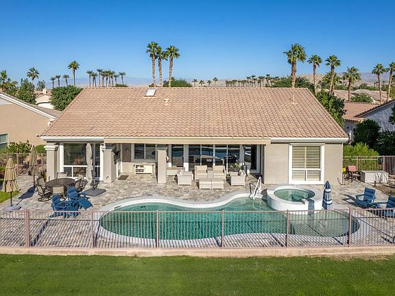 Sun City Palm Desert - Monaco. Beautifully upgraded inside and out this estate model home is one of the best. The south facing year yard provides panoramic golf course and mountain views and features a salt-water, pebbletec pool and spa. A spacious Turkish travertine patio, lush desert landscaping and electric awning make the year ideal for leisure or entertaining. There is curb appeal is immediately noticeable with an updated paint scheme, paver hardscape and leaded glass front doors. Inside, 24x24in tile is throughout. Contemporary fans and lighting are throughout. All bedrooms have plantation shutters. All bathrooms have quartz counters, upgraded sinks & fixtures. The greatroom has a 12ft ceiling and double slider to the rear patio. The chef's kitchen features quartz counters, a huge island with breakfast bar, stainless appliances & single basin sink, under cabinet lighting and pantry. The extended primary suite has a slider to the rear patio & huge walk-in closet with built-ins. The primary suite bathroom has dual sinks, a stall shower & oversized tub. The extended guest suite has French doors to the courtyard. The other guest suite is currently being used as an office. Its bathroom has a custom tile shower. A spacious bonus room is great for crafts or an office. The extended 2+ golf cart garage has an epoxy floor, overhead and hanging rack storage. Dual AC and the water heater are new within 4 years.