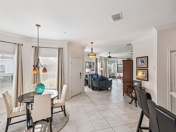 Sought after Heritage Hills is a vibrant 55 plus community located in beautiful Clermont! This popular St Marten villa has 2 bedrooms with 2 bathrooms plus a flex room and a 1 car garage. This end unit allows for lots of natural light in the villa and there is a screened lanai for enjoying the Florida outdoor weather! This open floor plan is perfect for entertaining! In the kitchen you will notice all the cabinet space, quartz counter tops, NEW refrigerator, breakfast bar with pendant lighting plus a pantry! All tile throughout the living area with carpet in the two bedrooms. The entire home has crown molding! The primary suite includes an oversized walk in closet, dual sink quartz counter tops and a tiled walk in shower. The flex room can be used as an office, additional sitting room, craft room, etc. The secondary bedroom is private from the rest of the main living area and makes a perfect guest room. Landscaping has been beautifully updated! All window treatments stay! Heritage Hills amenities include a heated pool and spa, pickle ball, tennis, basketball, bocce ball, shuffleboard, clubhouse with planned activities, fitness center, art and crafts room, billiard room, golf simulator, card room and ballroom for holding events. Exterior is painted every 5-6 years! The roof is replaced at year 15 and the reclaimed irrigation water, is included in the HOA fee. There is a 5 mile walking trail around the community. Call today for a private showing!