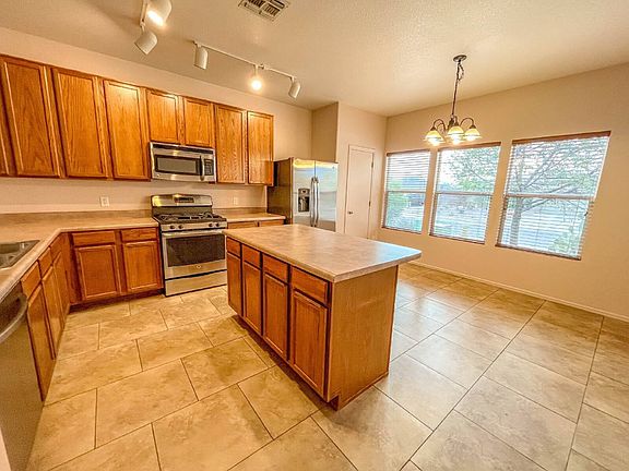 Beautiful Home on a large lot with Stainless Steel Appliances. 4bd/2ba home on the far west side of Tucson. Freshly painted interior, brand new carpet throughout, Led lights throughout, epoxied 2 car garage and Views of the Mountains from the backyard. Fiber optics ready for fast internet speeds-making working from home a breeze. Backyard patio slab just completed and ready for your patio furniture to watch the sunrise over the mountains. Backyard also to get new gravel within the next few days. Large front gate for easy access to the backyard for your toys. Enjoy a relaxing backyard with no neighbors behind you after a long day. Small dogs ok. Dishwasher, Disposal, Microwave, Oven, Refrigerator, Air Conditioning, Cable / Satellite, Gas Stove, Island, Carpet, Ceramic Tile, Laundry Room, Living Room, Primary Bath, Primary Bedroom, Blinds, Ceiling Fan, Double Pane Windows, Garage, Walk In Closet(s), Washer Dryer Hookups, Window Coverings & Pet Friendly. Listing provided by RentalSource.