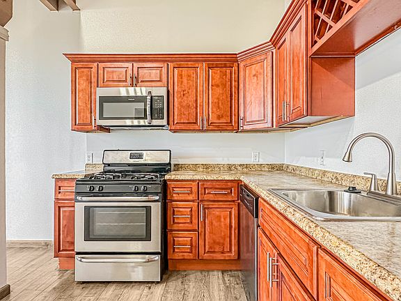 The heart of this home is the well-appointed kitchen, featuring rich cherry wood cabinetry, speckled countertops, and stainless steel appliances including a refrigerator, stove, microwave, and dishwasher. A built-in wine rack adds a touch of sophistication. The kitchen seamlessly flows into the living and dining areas, making it ideal for entertaining. The living room is brightened by large windows that offer a glimpse of the surrounding neighborhood, while a modern ceiling fan with lighting ensures comfort.