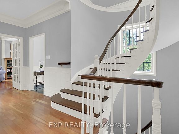 Serene picturesque tree-lined lanewayNatural landscapingFlagstone walkwaysPerennial gardensCovered front porchSpacious marble-tiled foyerRich cherry hardwood floors